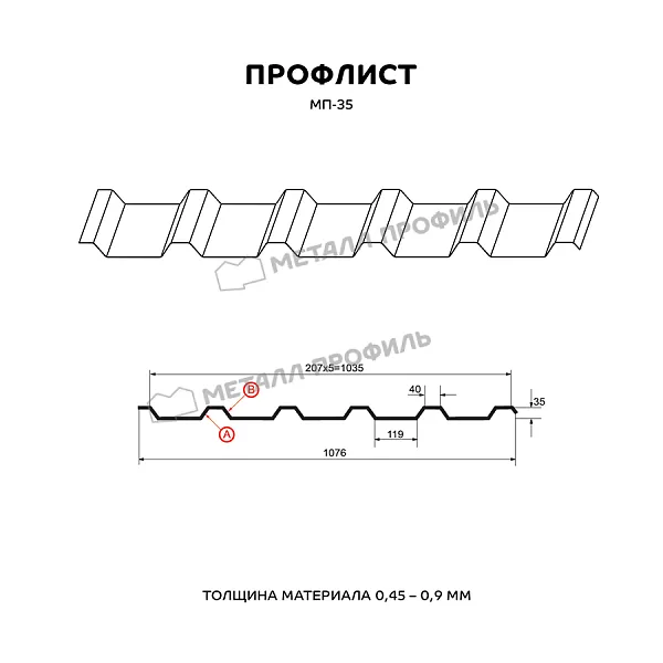 Профлист МЕТАЛЛ ПРОФИЛЬ МП-35x1035-B (ПЭ-01-1035-0,45) часто используется для обустройства профилированного листа. Представляет собой стальной оцинкованный лист с покрытием. Толщина металла с цинковым и декоративно-защитным покрытием — 0.45 мм. Проходя процедуру холодного проката, металл принимает волнообразный вид. Такая форма придает профилю жёсткость.Профиль МП-35: