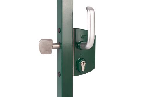 Описание товара: "Замок LSKZ 6060 U2L для откатных ворот корпус металл, с ручками из алюминия зеленый RAL 6005"